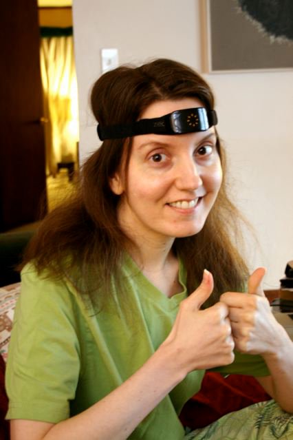 I have also felt the beams circling my skull while having an MRI done, so I already know I’m a freakshow when it comes to matters of the brain. I had Chimp put the headband on to see if he could feel it, but he wasn’t able to.