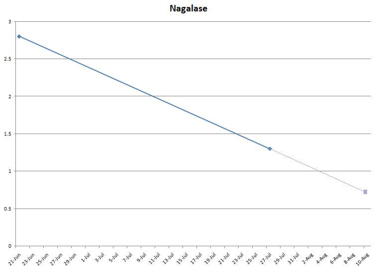 Dr. Cheney said that going into the use of GcMAF, he thought the aim would be to drive nagalase to zero, because zero is the normal value in healthy people. However, as patients arrived there, he found that a nagalase value below 1 appeared to coincide with the onset of a cytokine storm and regression – some cases milder, some more severe. Since then, he’s been counseling patients to stop before we get below 1. My graph definitely fit that pattern – if my nagalase had continued dropping in this roughly linear fashion (which of course, isn’t necessarily the case), it would predict that my cytokine storm would begin approximately where it did.