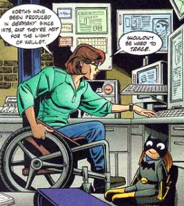As Commissioner Gordon’s daughter, she is shot through the spinal cord by the Joker. Paralyzed from the waist down, she is relegated to a wheelchair, and retreats from her crime-fighting past. Eventually, though, in response to her straitened physical circumstances, she emerges from the shell the wounding has put her in and turns her prodigious intellect, remarkable memory, research abilities, and knowledge of computers to a new role as an information broker, backing Batman, Nightwing (the former Robin), and the Birds of Prey and helping them succeed in fighting crime from behind the scenes.